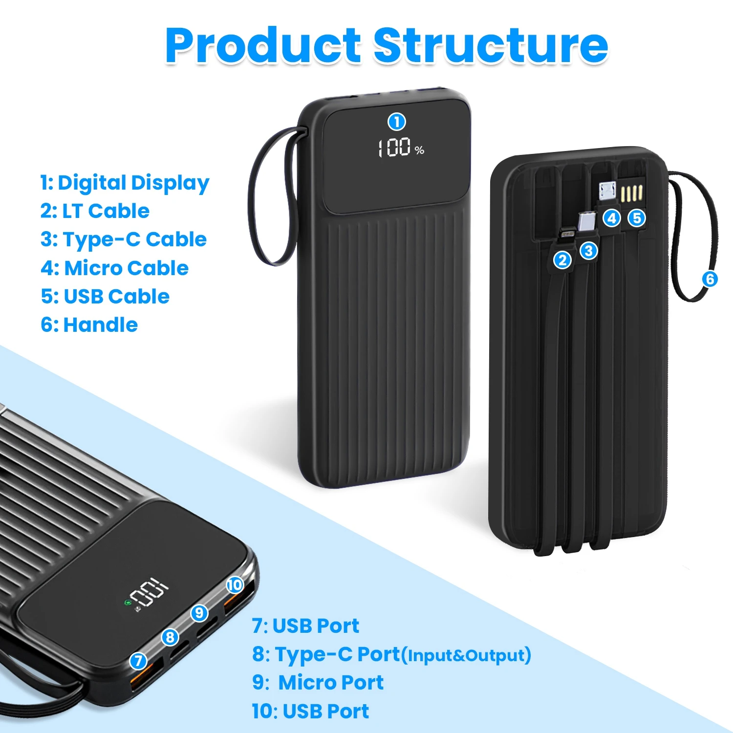- *Versatile Recharging*:With 3 inputs(Type-C Port+Micro Port+USB Cable) you have more options when recharging our fast charger. The remaining power can be clearly seen via pecentage number on the digital display screen,a friendly reminder for recharging. The extra Type-C USB cable also provides much convenience for phone charging and power bank recharging.